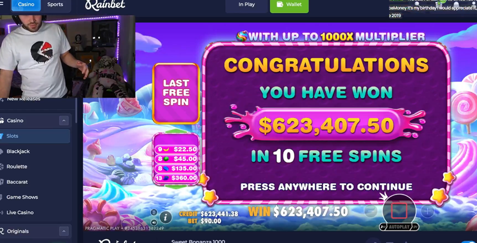 Summary: Adin Ross recently shifted partners from Stake to competing crypto casino RainBet. It was a move that made the VegasSlotsOnline News headlines as he supposedly made a $50m signing bonus. This week, Ross bagged a huge win with his new casino partner. He was playing on Sweet Bonanza 1000 with bets of $90 when he hit a multiplier win of 6,927x. That turned his bet into a staggering $623,497.50.